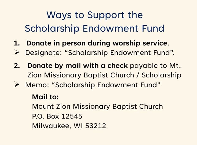 The Scholarship Endowment Fund also needs your help of kind donations to support the next generation of Mt. Zion students.